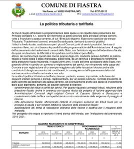 Il capitolo dedicato a “La politica tributaria e tariffaria” dell’amministrazione di Fiastra, scritto il 27 marzo del 2019 alla vigilia delle elezioni, è pari pari a quello vergato di pugno dal sindaco di Cassano, Alessandro Busseti, a fine luglio del 2018. Una bella pagina da leggere per scoprire che, come i nostri amici piemontesi, a Fiastra soffriamo ad esser diventati null’altro che esattori dello Stato e dell’incapacità di riscuotere le imposte, dato l’impoverimento della popolazione (che poi da noi ci sia stato il terremoto e che lo Stato rimborsi l’Imu sospesa è solo un dettaglio). E che abbiamo gli stessi orientamenti anche per quanto riguarda la politica della spesa (e pure qui i problemi non è che siano gli stessi).